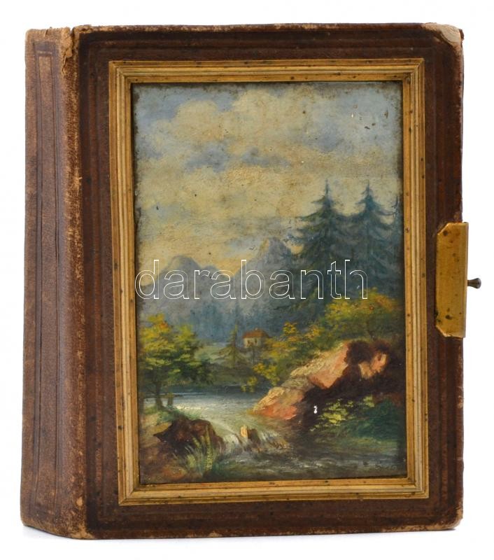 Leírás: cca 1890-1900 Egészbőr fotóalbum, az elülső táblán kis tájképpel (olajfestmény), aranyozott lapélekkel, kopott, fotók nélkül, 14x10x3 cm