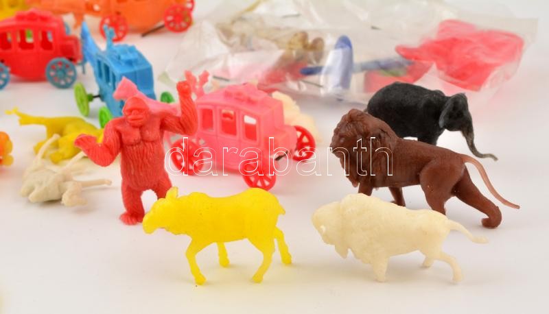 Leírás: Vegyes műanyag játék tétel: kocsik, állatok, stb.
