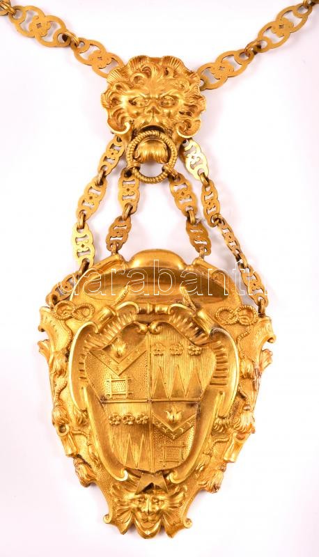 XIX. sz.: Tűzaranyozott bíborosi lánc. Nagyméretű címeres függővel 10,5 cm Hozzá készült dobozban / Gold plated metal high priest (cardinal) chain with costuma made box.