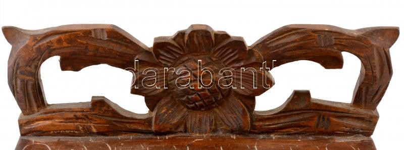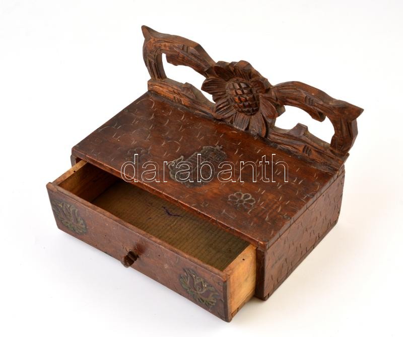 Leírás: cca 1880 Címeres faragott, karcolt fa fiókos doboz, alján apró repedéssel, 24×13 cm, m:16 cm