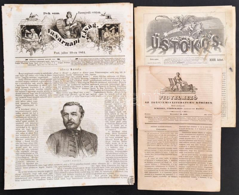 1839-1871 Vegyes újság tétel, 3 db: 1839 Figyelmező. Az Egyetemes Literatura' Körében. Szerk.: Schedel (Toldy Ferenc), Vörösmarty (Mihály), Bajza (József.) 1839. December 10. 49. szám., foltos, 809-824 (kéthasábos számozás) p. 1864 Vasárnapi Újság. 1864. július 10. XI. évf. 28 sz. Kiadó-tulajdonos: Heckenast Gusztáv. Díszes fejléccel a címlapon, szövegközti illusztrációkkal, korabeli reklámokkal, közte Borsos és Társa, Simonyi Fényirdái reklámokkal, valamint cs. és kir. szabad Tiszavidéki Vasút menetrendjével. A címlap sarkán bélyegzéssel. Pest, Landerer és Heckenast-ny., kissé foltos, 273-284 p. 1871 Üstökös. 1871. április 7., XXIII. kötet. 15. sz. Szerk.: Jókai Mór. Rajzolta: Jankó, metszette: Pollák. Díszes fejlécű címlappal. 174-175. oldalon karikatúrákkal. Korabeli reklámokkal, közte sorsjegy reklámmal. Pest, 1871, Athenaeum-ny., a címlap és az utolsó lap foltos, a címlapon kis lyukakkal, 157-158,171-177+3 p.