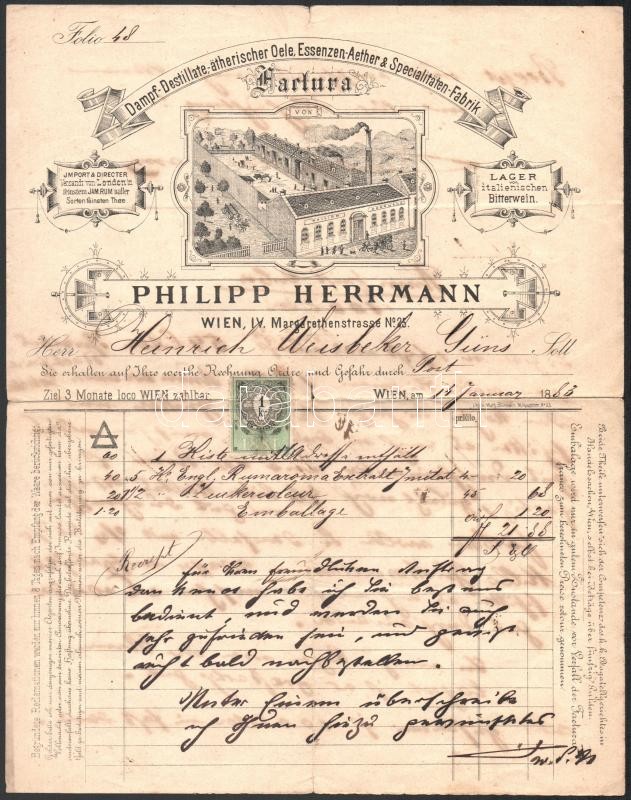 Leírás: 1889 Philipp Hermann Wien, vegyianyaggyár fejléces számla