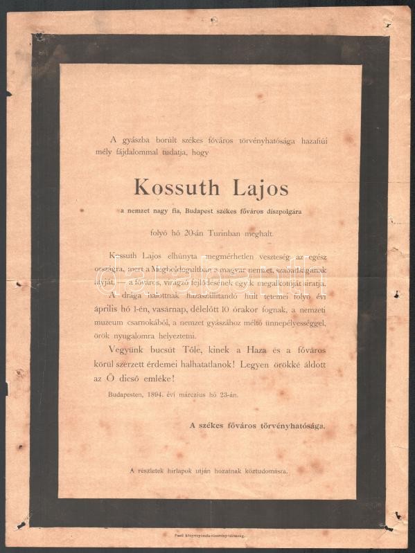 Leírás: 1894 Kossuth Lajos halálát hirdető székesfővárosi hirdetmény. 26x34 cm