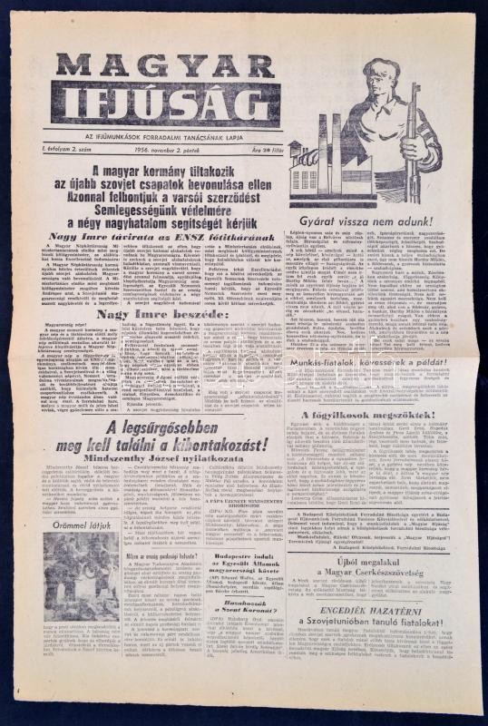 1956 a Magyar ifjúság forradalmi lap 1. évf. 2. lapszáma (nov. 2.), ér... https://www.darabanth.com/hu/356-Gyorsarveres/356.0/Mutargy-papirregiseg-egyeb/Nyomtatvanyok~500029/1956-a-Magyar-ifjusag-forradalmi-lap-1-evf-2-lapszama-nov-2-erdekes-hirekkel~II2040997