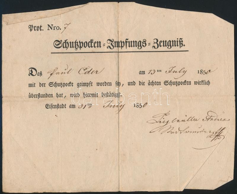 Leírás: 1850 Kismarton, himlőoltási bizonyítvány