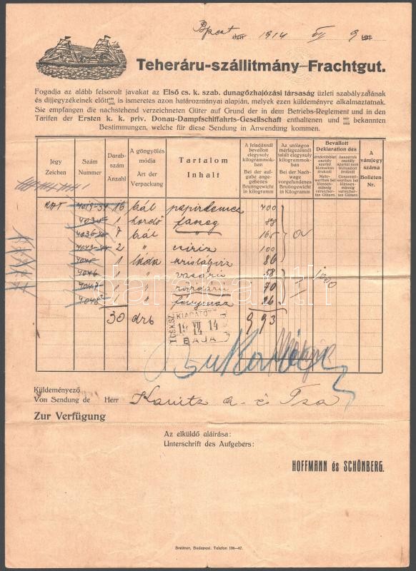 1914 Első cs. k. szab. dunagőzhajózási társaság számla https://www.darabanth.com/hu/356-Gyorsarveres/356.0/Mutargy-papirregiseg-egyeb/Okmanyok~500017/1914-Elso-cs-k-szab-dunagozhajozasi-tarsasag-szamla~II2023727