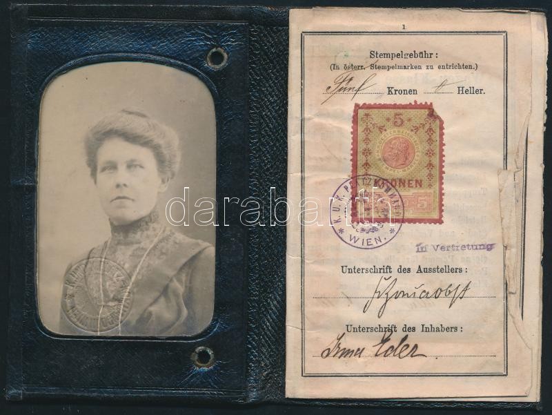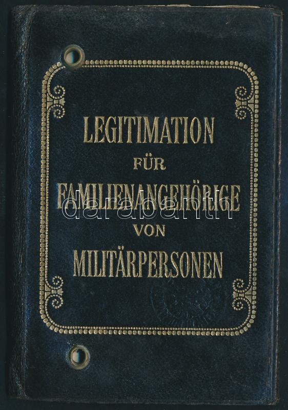 1916-1918 Cs. és Kir. Osztrák Államvasutak (K. k. österreichische Staatsbahnen) fényképes igazolványa katona személyek családtagjai részére, Wien, K. u. K. Platz-Kommando, német nyelven, hosszabbításokkal. Aranyozott egészbőr-kötésben.