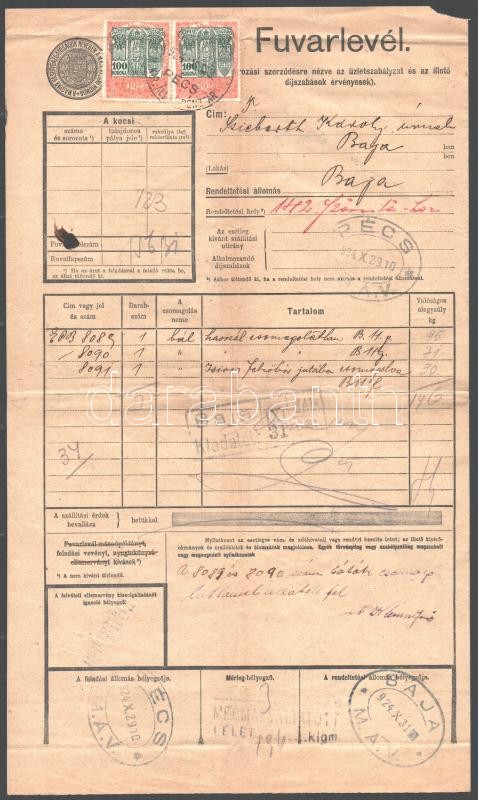 Leírás: 1922-1924 2 db fuvarlevél, Pécs-Baja szakaszon szállított árukról