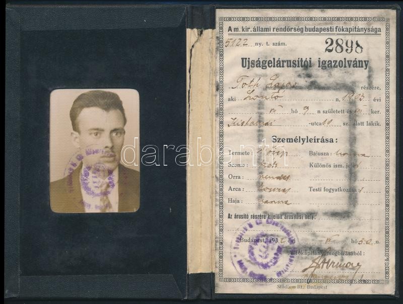 Leírás: 1932 Fényképes újságelárusítói igazolvány
