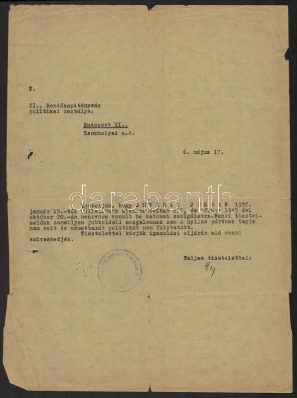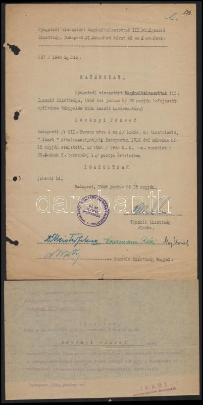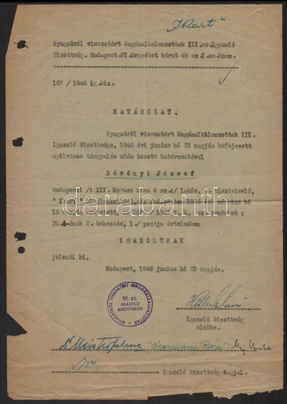 Leírás: 1946 Bp., Nyugatról visszatért magánalkalmazottak III. sz. igazoló bizottsága által kiadott határozat