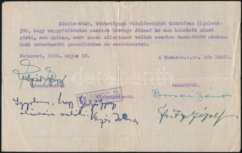 Leírás: 1946 Nyilas vád alóli tisztázáshoz igazolás