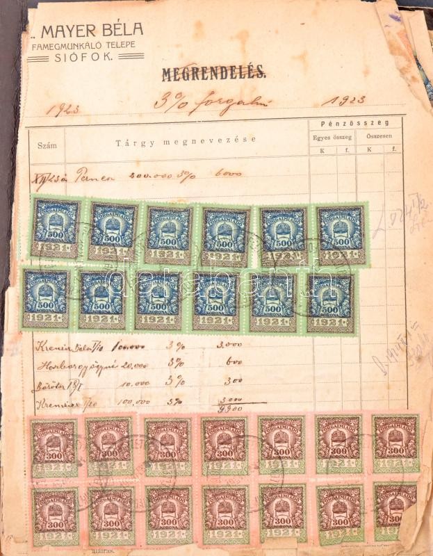 Leírás: Forgalmi adó könyv lapjai 1922-1923-ból összesen több száz darab forgalmi adó bélyeggel