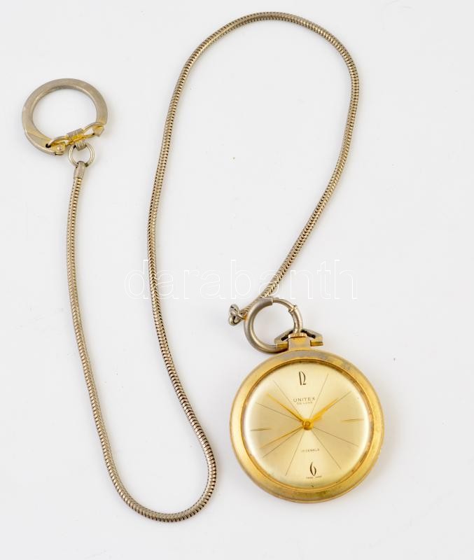 Leírás: Unitex mechanikus zsebóra tisztításra szoruló szerkezettel. fém lánccal