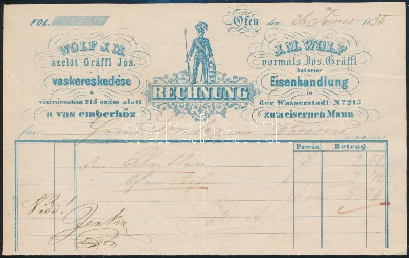 Leírás: 1855 Viziváros Wolf J. M. vaskereskedés fejléces számlája