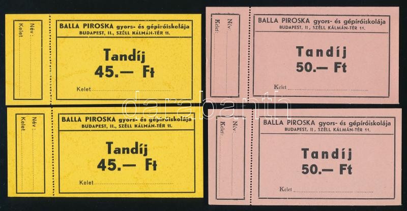 Leírás: Balla Piroska Gyorsíró- és Gépíróiskolájának szórólapja és tandíjjegyei, 5 db