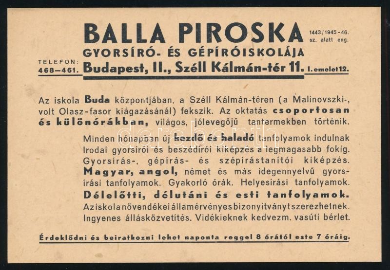 Balla Piroska Gyorsíró- és Gépíróiskolájának szórólapja és tandíjjegye... https://www.darabanth.com/hu/356-Gyorsarveres/356.0/Mutargy-papirregiseg-egyeb/Reklam~500021/Balla-Piroska-Gyorsiro-es-Gepiroiskolajanak-szorolapja-es-tandijjegyei-5-db~II2016393