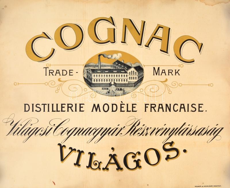 Leírás: Cognac, Világosi Cognacgyár Rt., reklámplakát, Kellner és Mohrlüder, Budapest, felcsavarva, kis szakadással, szélein foltos, 40,5×50,5 cm