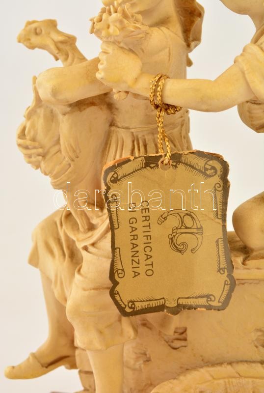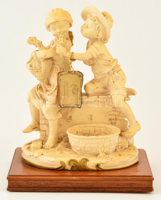 Leírás: Jelzett (G.A) udvarló kisfiú, műgyanta, apró repedéssel, fa talapzaton, m: 22 cm