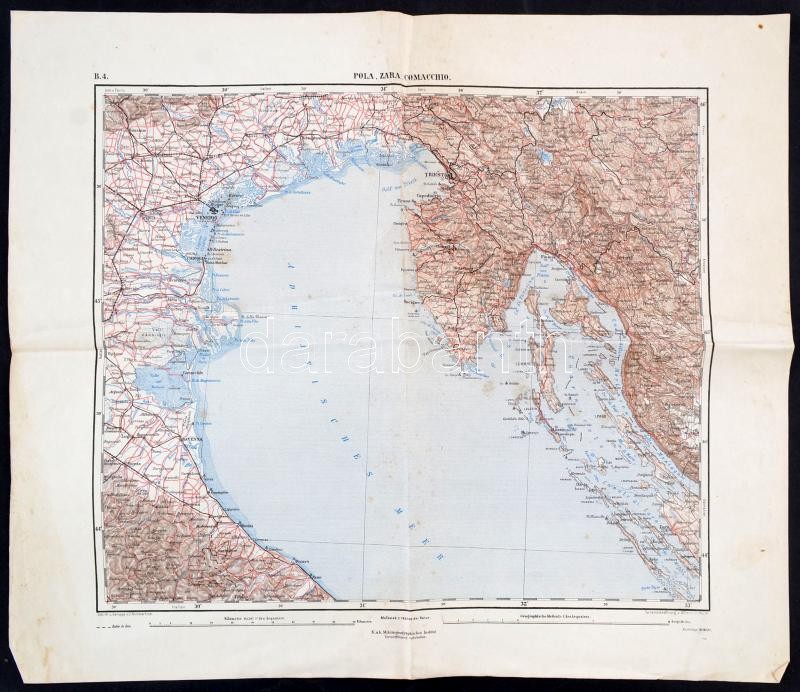 Leírás: cca 1910 Pola, Zara, Comacchio térkép, 1:750.000, K.u.K. Militärgeographisches Institut, hajtásnyommal, 34x40 cm.