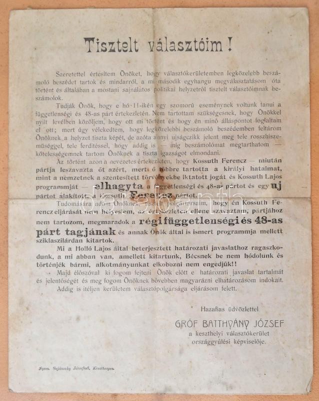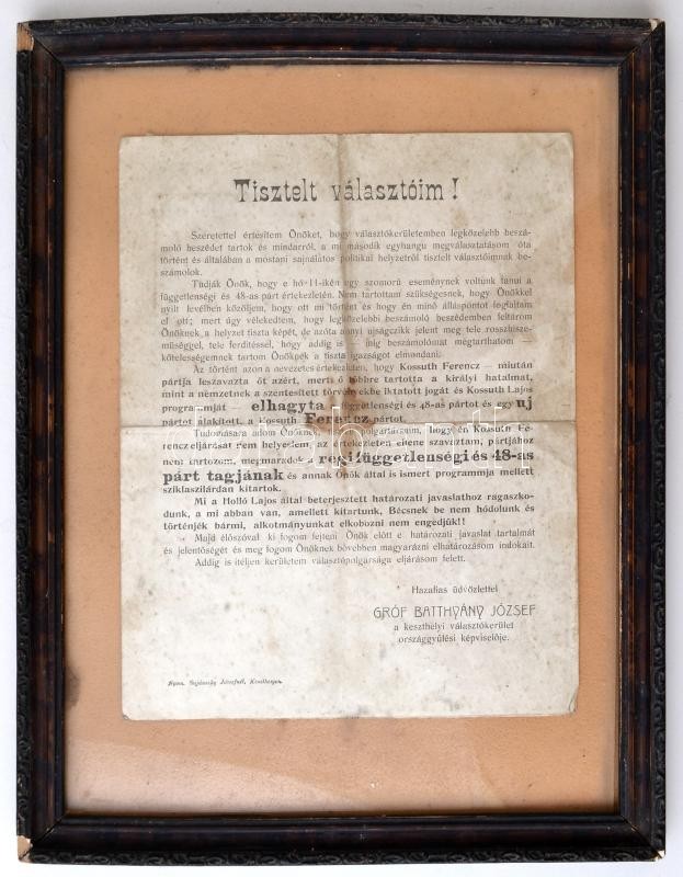1909 Tisztelt Választóim! Batthyány József (1858-1922) földbirtokos, országgyűlési képviselő beszámoló beszédre invitáló röplapja, foltos, üvegezett, fa keretben, röplap: 25x20 cm, keret: 36x28 cm.