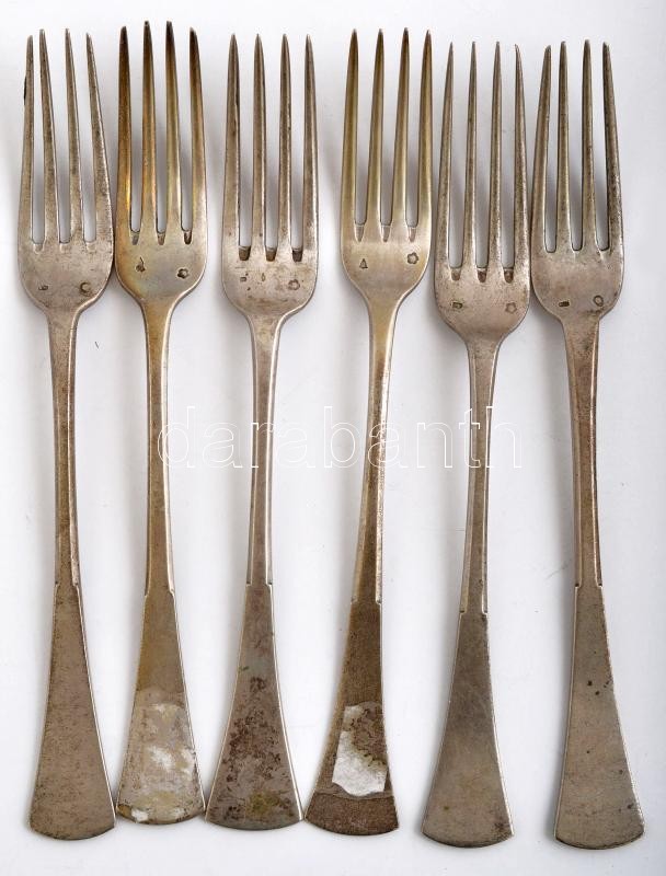 Ezüst (Ag.) villa készlet ( 6db), jelzett, h: 18 cm (6×), nettó:287 g https://www.darabanth.com/hu/356-Gyorsarveres/356.0/Nemesfem-Disztargyak-Orak-es-Ekszerek/Nemesfem-Disztargyak-Orak-es-Ekszerek~500032/Ezust-Ag-villa-keszlet-6db-jelzett-h-18-cm-6C397-netto287-g~II1933187