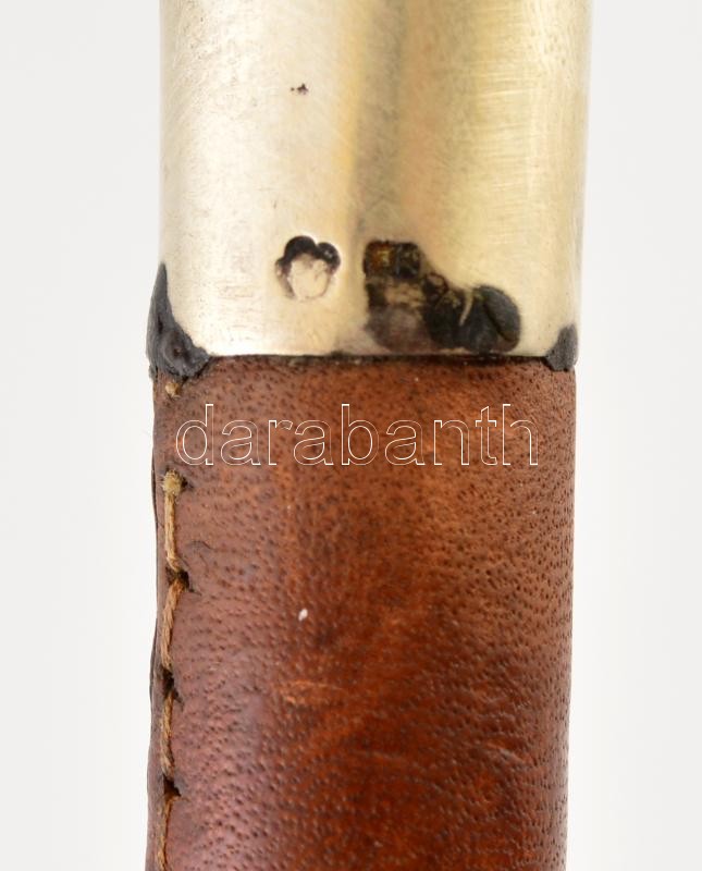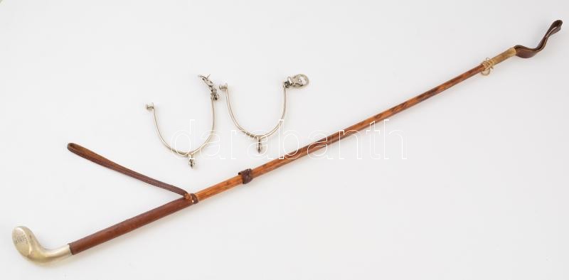 Leírás: Ezüst fejű lovaglópálca PK nemesi mongrammal. Jelzett. + 2 fém sarkantyú