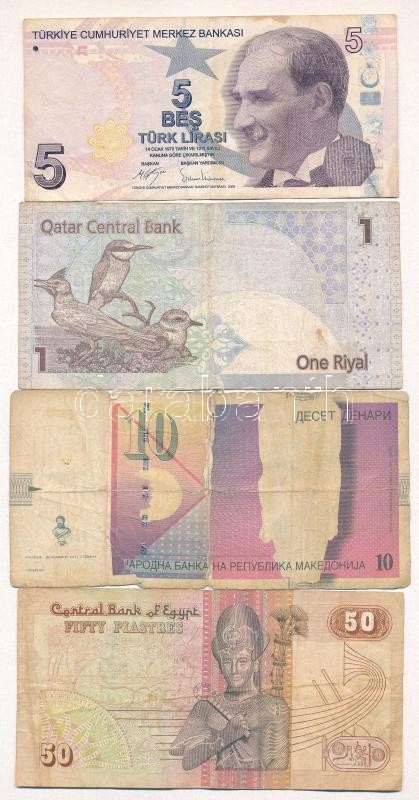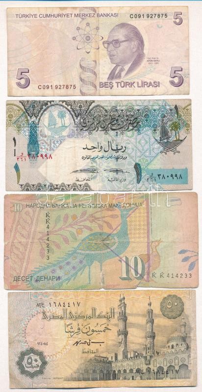 Vegyes 5db-os papírpénz tétel, benne bolgár, török, katari, macedon és egyiptomi bankjegyek T:III,III-
