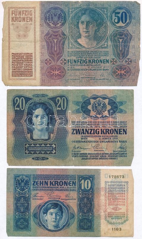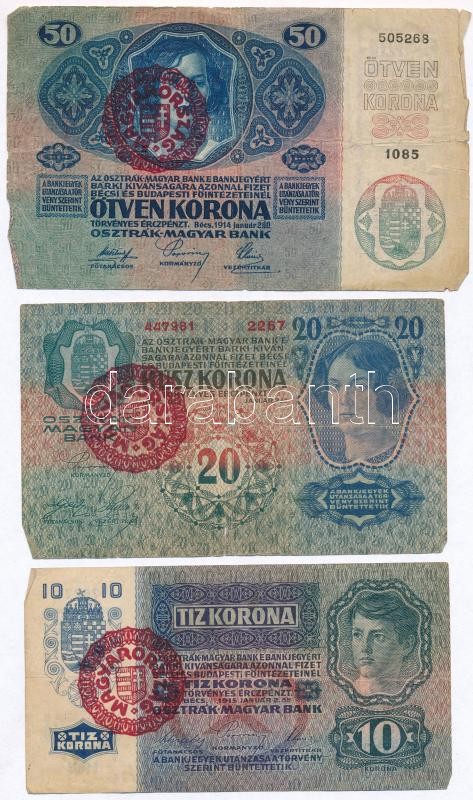 Leírás: 1913. 20K + 1914. 50K + 1915. 10K mindhárom piros "MAGYAROSZÁG" körbélyegzővel T:III- lyuk