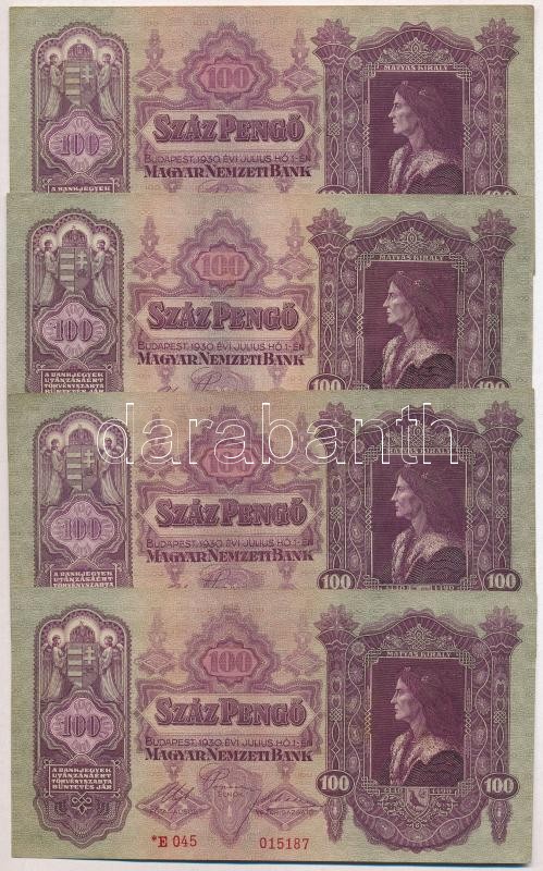 1930. 100P (4x) mind csillagos sorozatszámú T:III Adamo P17 https://www.darabanth.com/hu/356-Gyorsarveres/356.0/Numizmatika/Magyar-bankjegyek~2500008/1930-100P-4x-mind-csillagos-sorozatszamu-TIII-Adamo-P17~II2020967