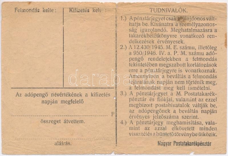 Leírás: 1946. 100.000AP nem kamatozó Pénztárjegy "Magyar Királyi Postatakarékpénztár" felülbélyegzéssel T:III- ly., szakadás