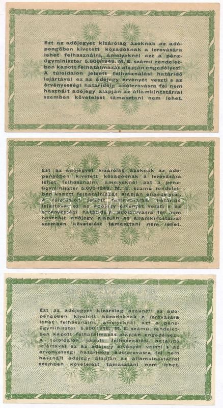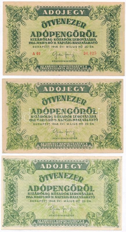 Leírás: 1946. 50.000AP (3x) változatok: sorszámmal, vízjeles papíron; sorszám nélkül vízjeles papíron; vastagabb, vízjel nélküli fehér papíron T:II,II-