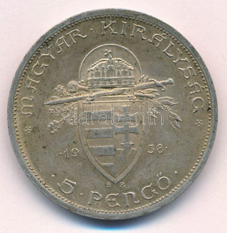 Leírás: 1938. 5P Ag "Szent István" T:2 patina