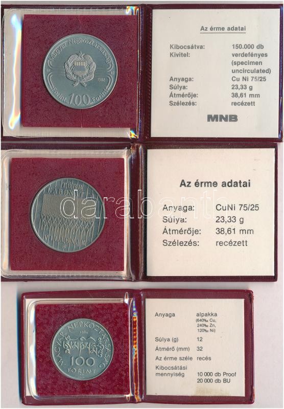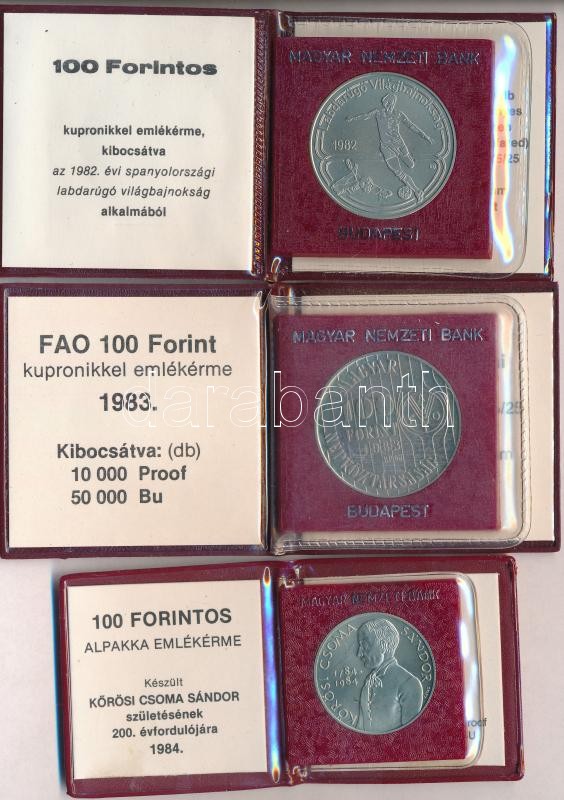 Leírás: 1982. 100Ft Cu-Ni "Labdarúgó Világbajnokság 1982" eredeti MNB tokban tanúsítvánnyal + 1983. 100ft Cu-Ni "FAO-SOROZAT II. - Több gabonát a világnak" eredeti tokban, tanúsítvánnyal + 1984. 100Ft alpakka "Kőrösi Csoma Sándor" eredeti tokban, tanúsítvánnyal T:1,BU patina