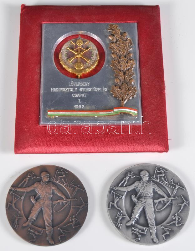 Leírás: ~1970. "Magasabb Egység Bajnokság" ezüstözött és bronzírozott fém emlékplakett dísztokban T:1 + 1962 "Lőverseny hadipisztoly gyorstüzelés" díjérem tokban. T:2