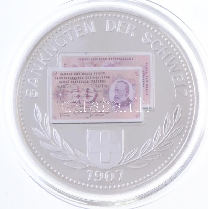 Svájc DN "Banknoten der Schweiz 1907 / Billets de Banque de Suisse - Banconote della Svizzera" ezüstözött Cu-Ni emlékérem 10Fr svájci bankjegy multicolor képével, tanúsítvánnyal (40mm) T:PP