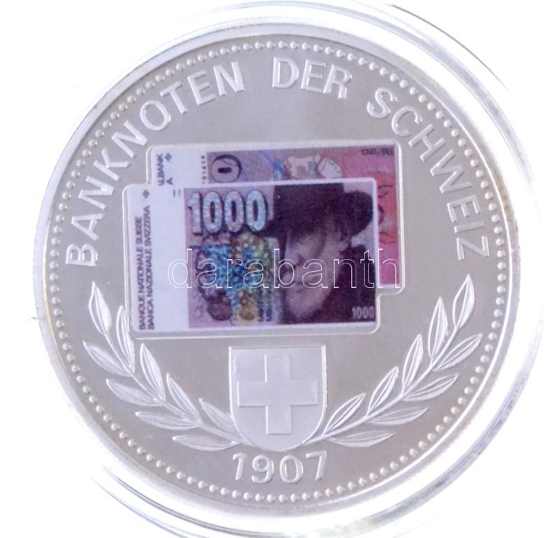 Svájc DN "Banknoten der Schweiz 1907 / Billets de Banque de Suisse - Banconote della Svizzera" ezüstözött Cu-Ni emlékérem 1000Fr svájci bankjegy multicolor képével, tanúsítvánnyal (40mm) T:PP Switzerland ND "Banknoten der Schweiz 1907 / Billets de Banque de Suisse - Banconote della Svizzera" silver plated Cu-Ni commemorative medallion with the multicolor image of 1000 Francs banknote, with certificate (40mm) C:PP
