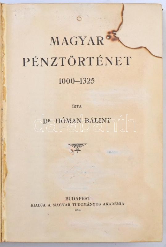 Hóman Bálint: Magyar pénztörténet 1000-1325. Budapest, 1916. MTA [Hornyánszky Viktor]. 710 p. + 1 kihajtható térkép és 4 kihajtható táblázat. Fűzve, kiadói félvászon kötésben (gerinc és egy-két lap széle hibás)