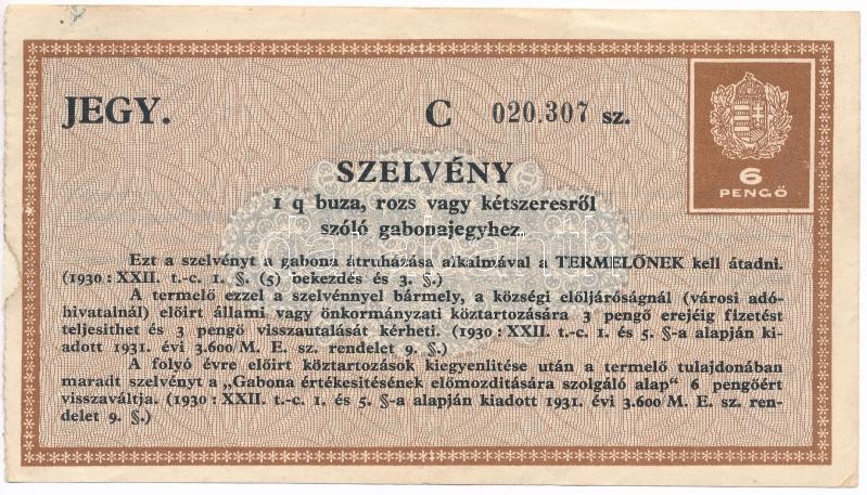 Leírás: 1931. 6P gabonajegy "C" szelvény T:III