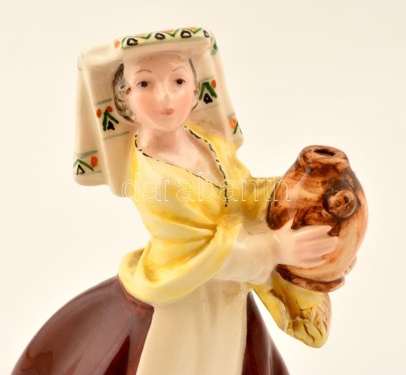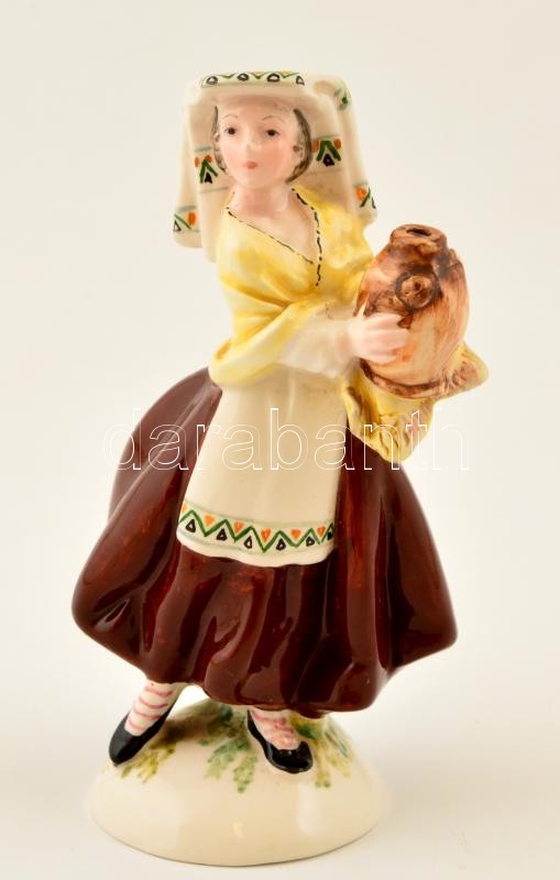 Leírás: Jelzett (Italy) kézzel festett mázas porcelán korsós asszony figura, apró kopásnyomokkal, m:13,5 cm