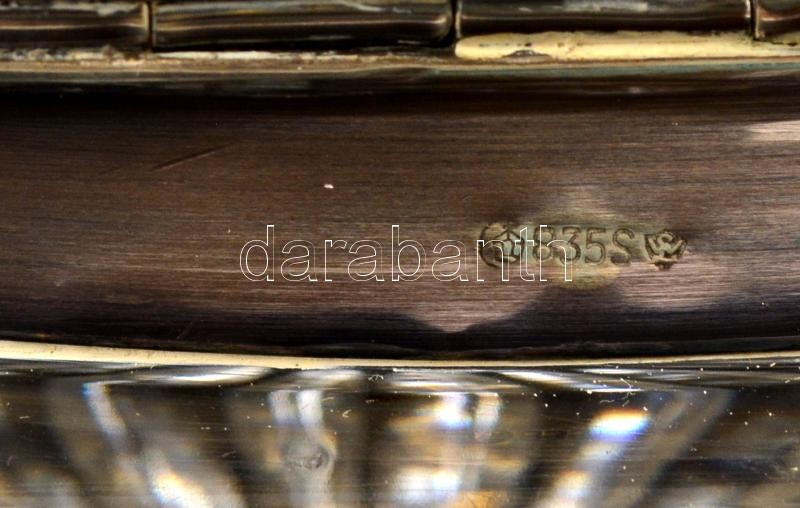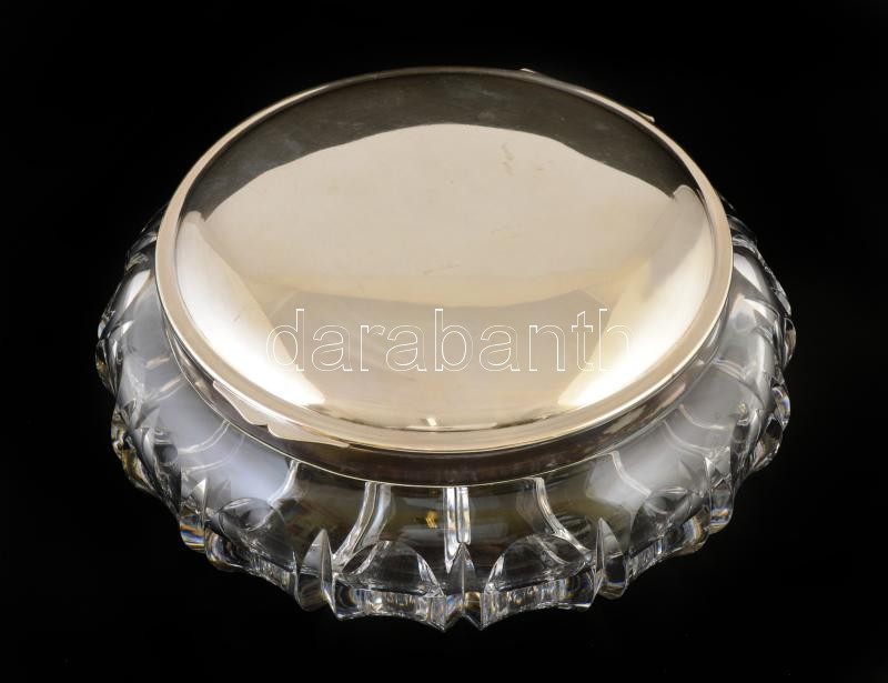 Leírás: Alpakka fedeles ólomkristály doboz, jelzett (SUM), apró csorbákkal, d:23,5 cm m:8 cm