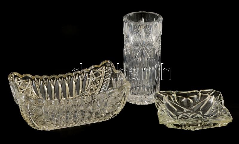 Leírás: Ólomkristály tál és váza + üveg hamutartó, 3 db, kis hibákkal