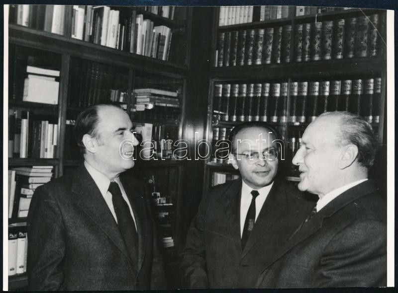 Leírás: A Francia Szocialista Párt küldöttsége Magyarországon, Mitterrand, Kádár János, feliratozott, pecséttel jelzett sajtófotó, 13×18 cm