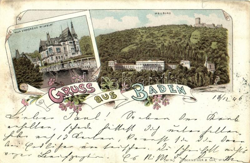 Leírás: 1896 (Vorläufer!!!) Baden bei Wien, Villa Erzherzog Wilhelm, Schloss Weilburg / villa, castle. Schneider & Lux No. 14. Art Nouveau, floral, litho (EK)