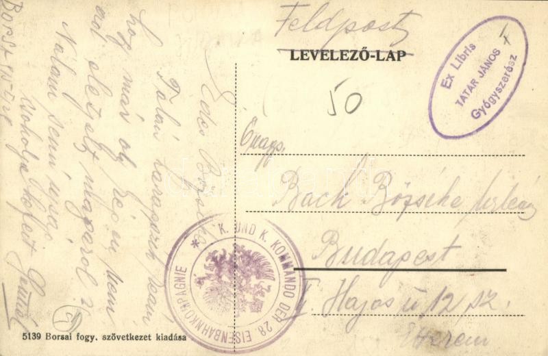 Leírás: 1915 Borsa, Borscha; Vas híd, Gyógyszertár. Kiadja a Fogyasztási Szövetkezet / bridge, pharmacy, street view + "K.U.K. KOMMANDO DER 28. EISENBAHNKOMPAGNIE" (EK)