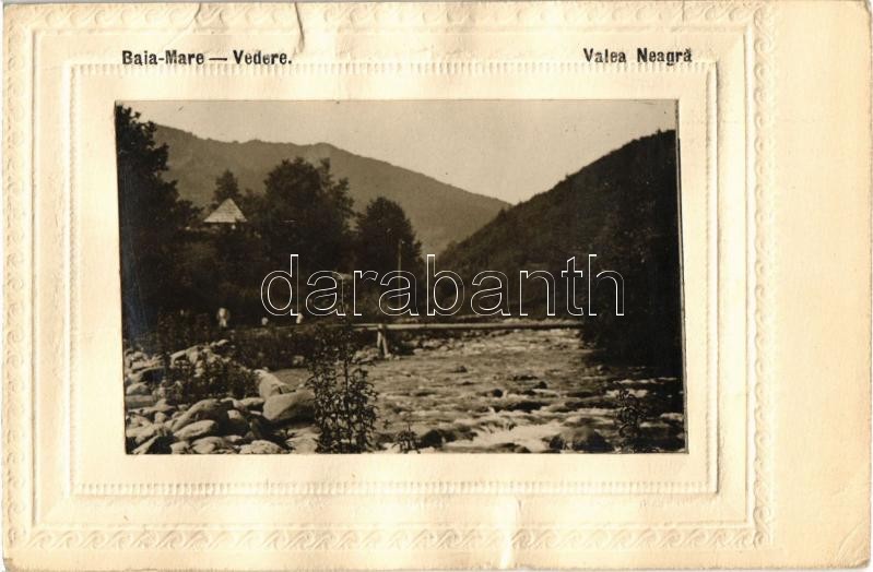 Leírás: Nagybánya, Baia Mare; Valea Neagra. Libraria si Tipografia Aladar Frankovits / Feketepatak, fahíd / creek, wooden bridge. photo (ázott / wet)