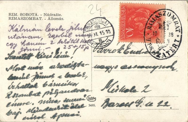 Leírás: Rimaszombat, Rimavská Sobota; Nádrazie / Vasútállomás, automobil / railway station, automobile + "1938 Rimaszombat visszatért" So. Stpl. (EK)