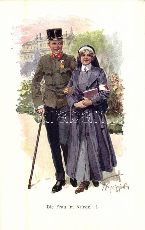 Leírás: Die Frau im Kriege I. Nr. 731. / WWI German military officer with Red Cross nurse, artist signed