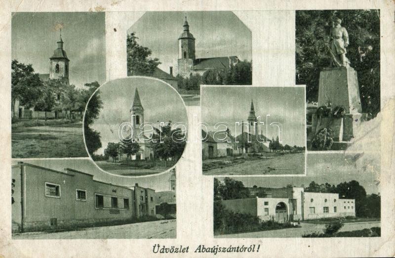 Leírás: 1944 Abaújszántó, Római katolikus templom, Görögkatolikus templom, Református templom, Hősök szobra, első világháborús emlékmű, Sportuszoda (EK)