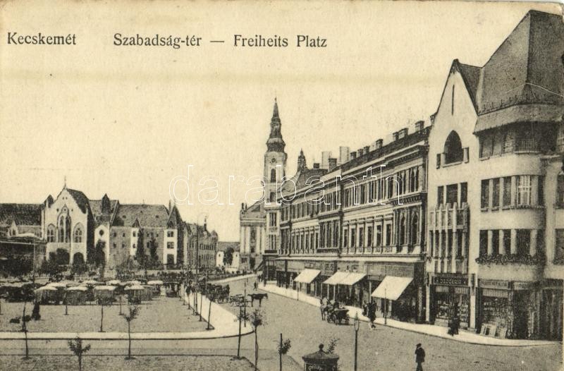 Leírás: Kecskemét, Szabadság tér, Városháza, üzletek, piaci árusok, drogéria (gyógyszertár). Kiadja Fekete Soma (EK)