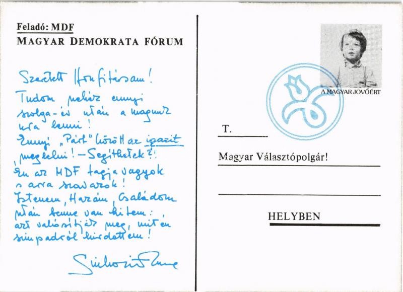 Leírás: Sinkovits Imre és Kubik Anna; Sütő András: Ádvent a Hargitán - modern lap, hátoldalon MDF (Magyar Demokrata Fórum) propaganda